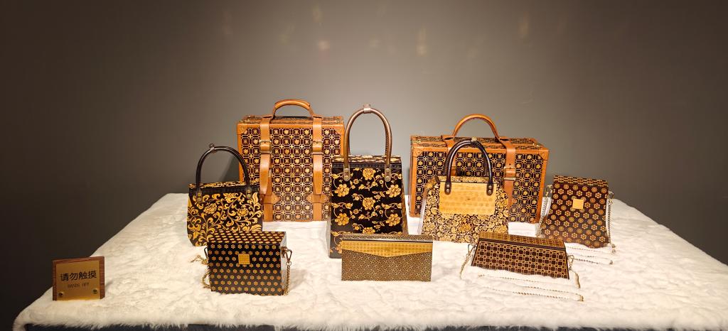 图为荣获第十七届中国民间文艺山花奖的骨木镶嵌箱包系列(一组9件)。新华社记者余俊杰 摄