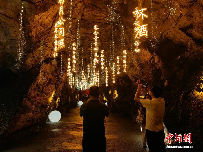 走进蓝田县辋川溶洞,记者看到景区内嵌入唐诗文化元素,通过光影技术在溶洞内展示唐诗300余首,吸引旅客驻足拍照。